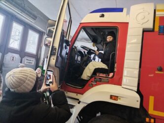 Далее гости прошли в гараж боевых машин, где им продемонстрировали пожарные автомобили и вооружение закрепленное на них. Ребята смогли посидеть в настоящем  боевом автомобиле, примерить боевую одежду и каску  пожарного и фотографироваться на память, ощущая себя хоть не на долго настоящими огнеборцами.